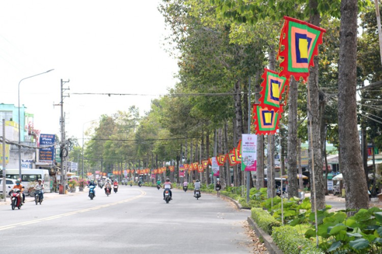 Treo cờ trên tuyến đường Phạm Hữu Lầu, đoạn từ cầu Cái Tôm - cầu Đúc (Phường 4, TP.Cao Lãnh) đến Khu Di tích Nguyễn Sinh Sắc nhân lễ giỗ lần thứ 91