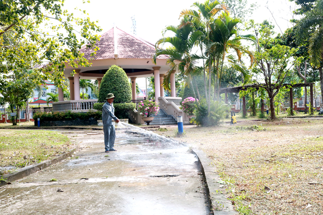 Nhân viên Khu Di tích Nguyễn Sinh Sắc vệ sinh trong khuôn viên khu di tích chuẩn bị cho lễ giỗ