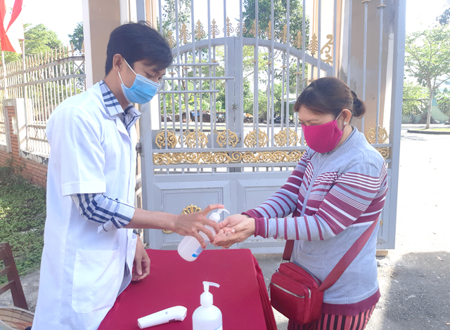 Trong các ngày diễn ra lễ giỗ, nhân viên y tế túc trực và đo thân nhiệt, rửa tay sát khuẩn cho người dân trước vào Khu Di tích Nguyễn Sinh Sắc
