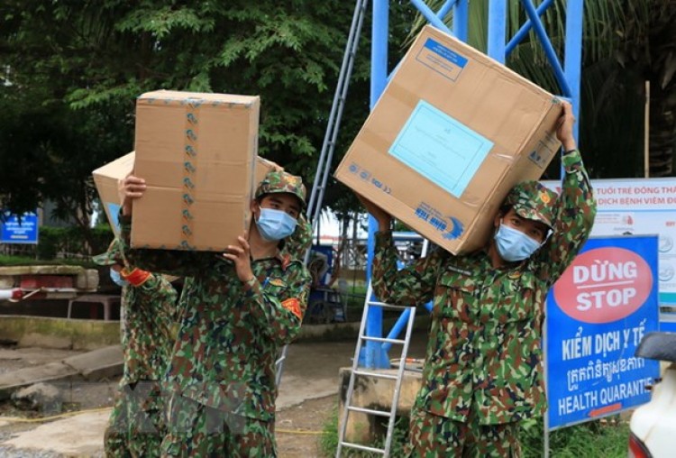 Bộ đội Biên phòng Đồng Tháp hỗ trợ vận chuyển 50.000 khẩu trang và 500 bộ đồ bảo hộ y tế trị giá hơn 90 triệu đồng trao tặng thanh niên tỉnh Prey Veng của Campuchia để phòng, chống dịch COVID-19. (Ảnh: Chương Đài/TTXVN)