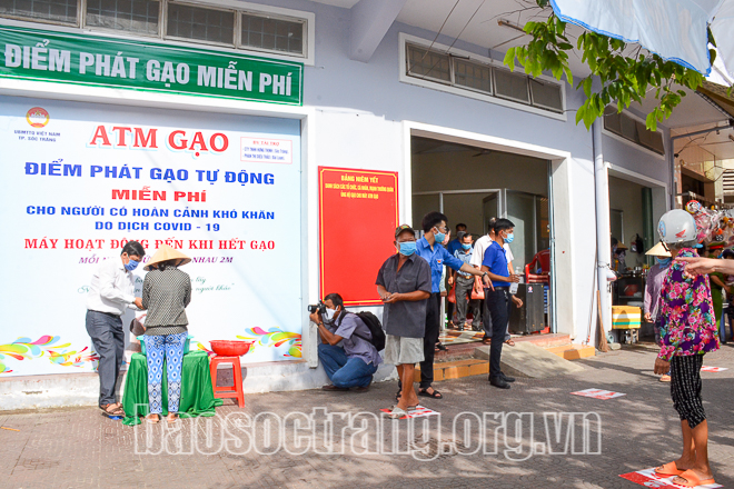 Đây là mô hình được UBND và Ủy ban MTTQ Việt Nam TP. Sóc Trăng phối hợp triển khai dưới sự hỗ trợ lắp đặt của một người con quê hương Sóc Trăng hiện đang sinh sống và làm việc tại TP. Cần Thơ. Cầm trên tay túi gạo, bà Lê Ánh Ngọc ở Khóm 2, Phường 3 xúc động: “Với 2kg gạo này tôi và người dì có được vài bữa no”. Bà Ánh thuộc diện hộ nghèo, mọi chi phí đều trông vào công phụ dọn dẹp nhà thuê. Nhưng từ khi dịch bệnh diễn ra, bà cùng người dì (bị liệt nằm một chỗ do tai nạn giao thông) rơi vào cảnh khó khăn. Bà Ánh cho biết thêm, khi nào hết gạo, bà sẽ quay lại lấy đến khi tìm được việc làm.
