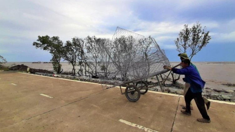 Lực lượng chức năng thực hiện rọ đá phòng, chống sạt lở đê biển Tây tỉnh Cà Mau, đoạn qua địa phận huyện Trần Văn Thời.