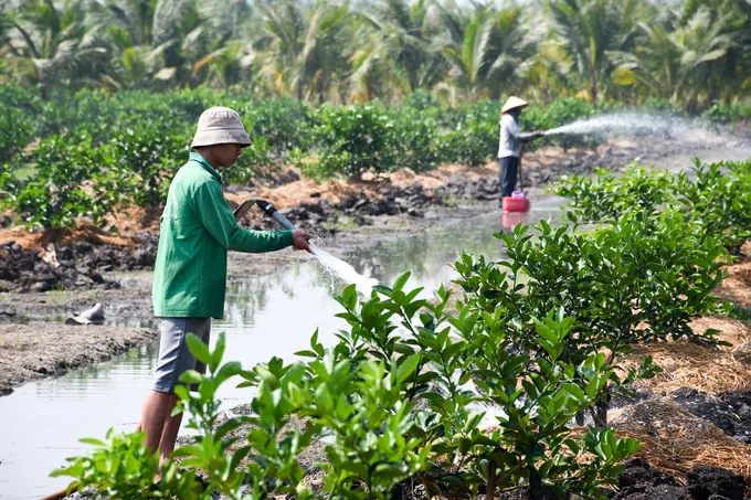 Nông dân xã Vĩnh Thạnh, tỉnh Tây Ninh chăm sóc chanh theo phương thức hữu cơ nhằm nâng cao giá trị sản phẩm. Ảnh: QUANG VINH