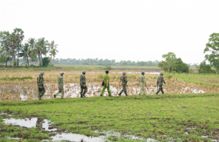 Sau khi dặn dò sĩ quan, chiến sĩ làm nhiệm vụ trực đơn vị, Trung tá Nguyễn Văn Tùng lên xe cùng chúng tôi lên đường ra khu vực biên giới. Con đường nhựa cắt ngang một cánh đồng lớn. Nhìn thoáng qua, tuyến biên giới khá thanh bình. Bà con qua lại làm ăn, mua bán, chăn thả gia súc. Nhưng quan sát kỹ, bên kia cột mốc biên giới, chúng tôi vẫn nhận ra những điểm, ổ tập kết hàng, có người và phương tiện túc trực, chờ sơ hở của cán bộ, chiến sĩ Biên phòng là tràn qua biên giới trên những bờ ruộng được gia cố bằng gạch đá. Bên đây, những cán bộ, chiến sĩ luôn phải tập trung, cảnh giác để sẵn sàng chốt chặn khi những chiếc xe thồ hàng băng ngang đồng.