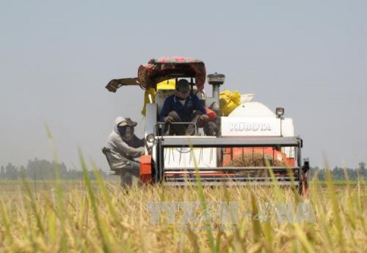 Thu hoạch lúa trên cánh đồng lớn thuộc vùng Đồng Tháp Mười (Long An). Ảnh: Trường Giang/TTXVN