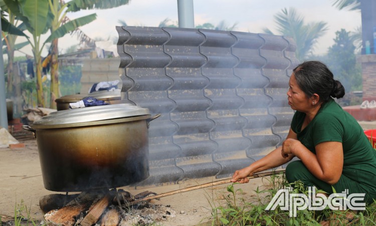 Nấu bánh tét phải thường xuyên canh lửa đều tay thì bánh mới chín ngon và không bị sượng.