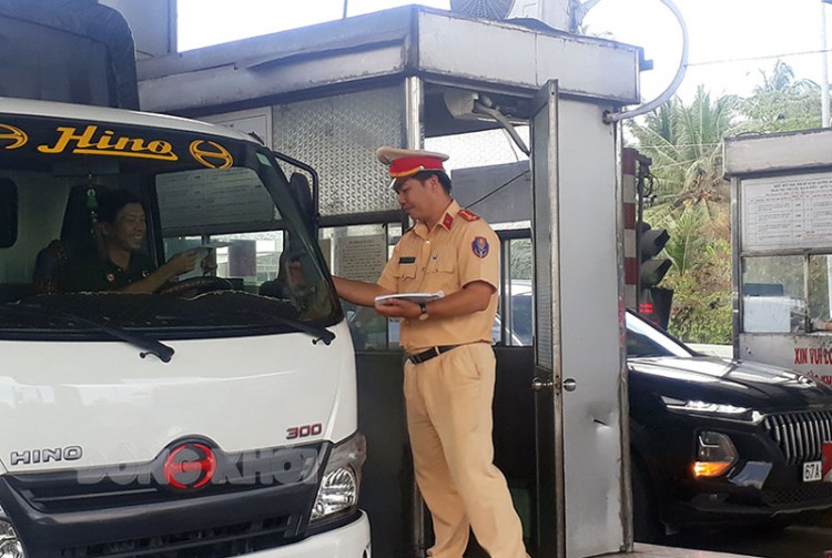Cảnh sát giao thông phát tờ bướm tuyên truyền giao thông tại khu vực trạm thu phí cầu Rạch Miễu.