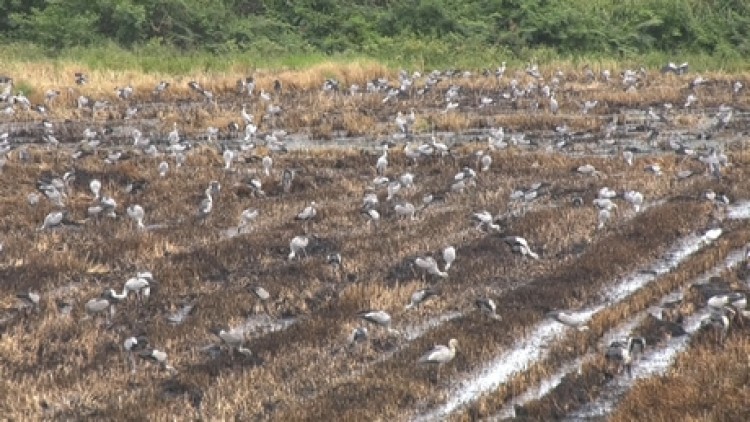 Trên cánh đồng này, nông dân đã đốt gốc rạ, bơm nước vào ruộng… chuẩn bị làm đất sạ lúa nên có nhiều nguồn thức ăn như: côn trùng, cua, cá, ốc- nhất là loài ốc bươu vàng, thức ăn chủ yếu của đàn cò ốc.