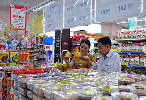 Ở siêu thị cũng như các cửa hàng đều đã bày bán các loại bánh, mứt, kẹo từ khá sớm, sức mua đang tăng dần theo từng ngày. Các sản phẩm bánh ngọt, bánh quy đóng hộp làm theo mẫu mã và màu sắc phù hợp làm quà tặng có giá cả đa dạng, từ 130.000-245.000 đồng/hộp. Hiện tại, một số mẫu hộp kích thước lớn phù hợp mua dùng làm quà biếu, gói vào các giỏ quà còn trong tình trạng “cháy hàng” liên tục. Các loại thực phẩm khác như giò, chả, lạp xưởng, thịt, trái cây và rau củ sẽ tăng cường vào những ngày cận tết khi sức mua cao hơn.