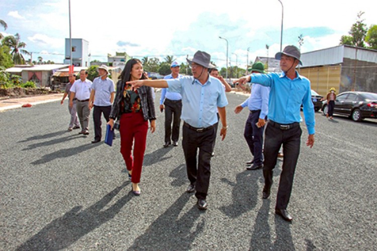 Đoàn công tác của UBND tỉnh khảo sát vị trí tổ chức lễ thông xe tại đầu tuyến (thành phố Ngã Bảy). Ảnh: NGUYỄN HẰNG