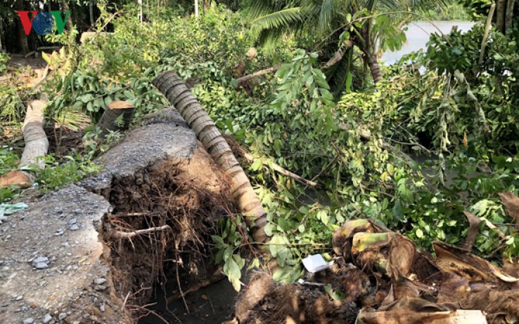 “Sạt lở dữ lắm rồi. Cái hàng dừa của tôi là cưa hết hai hàng dừa bây giờ còn gốc đó mà lở vô nữa đó, nó sụp nguyên bực không hà”, bà Dương Minh Nguyệt ở ấp Phú Đông, thị trấn Mái Dầm, huyện Châu Thành cho biết.