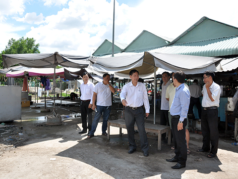 Đoàn khảo sát vị trí bán thịt heo bình ổn thị trường tại chợ phường IV.