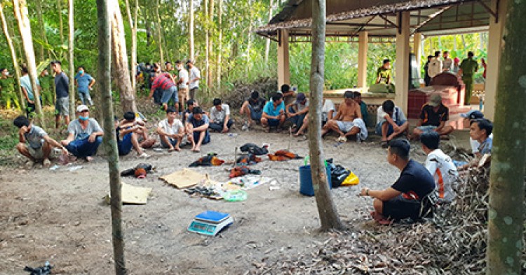 Khi lực lượng làm nhiệm vụ vào hiện trường, có 25 đối tượng không kịp chạy thoát. Tang vật tạm giữ, gồm: 6 con gà trống đá, trong đó có 2 con đang mang cựa sắt, 26 cuộn băng keo đã qua sử dụng, 3 bộ bầu cua, 1 cân điện tử và một số vật dụng liên quan. Kiểm tra trên người các đối tượng, cơ quan công an còn phát hiện và tạm giữ hơn 52 triệu đồng, 18 điện thoại di động.