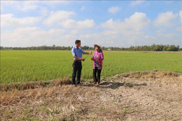 Ruộng lúa 1,7 ha của gia đình bà Phan Thị Lan, xã Tân Hiệp, huyện Trà Cú bị thiệt hại hoàn toàn 1 ha do xâm nhập mặn. Ảnh minh họa: Thanh Hòa/TTXVN