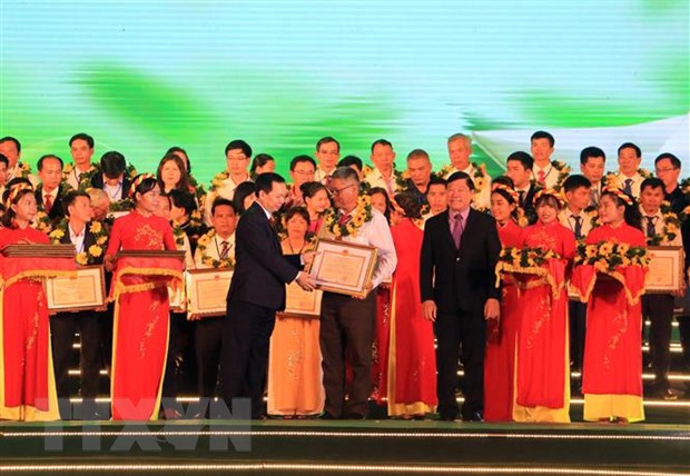 Tuyên dương tập thể, cá nhân điển hình tiên tiến có thành tích xuất sắc trong lĩnh vực phát triển hợp tác xã nông nghiệp trong 2 năm (2018-2019) tại lễ khai mạc Festival. (Ảnh: Phạm minh Tuấn/TTXVN)