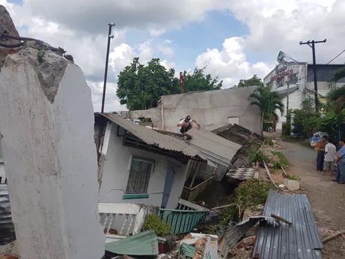 Nhiều căn nhà bị sụp xuống sông Tiền vào sáng 26-6 do sạt lở. Ảnh: CA LINH