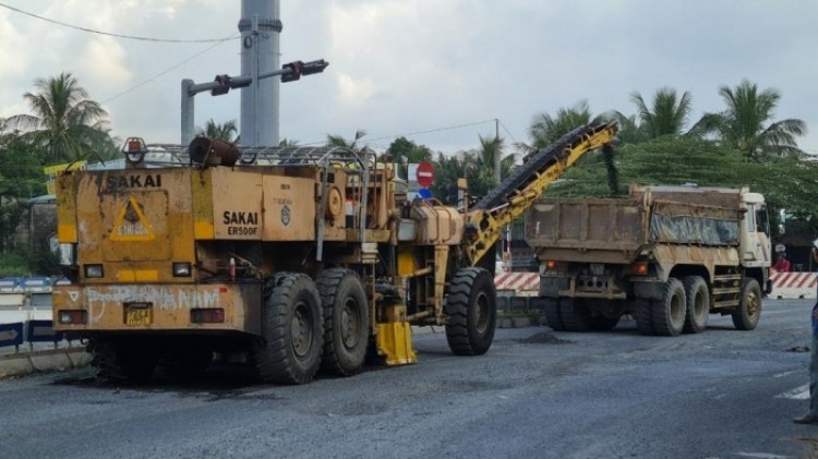Thi công sửa chữa những điểm hư hỏng trên tuyến tránh BOT Cai Lậy.