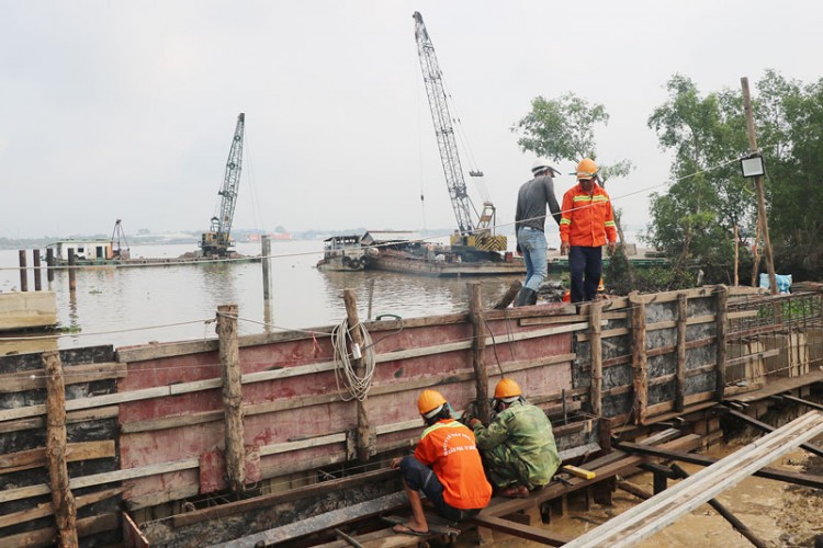 Không khí trên công trường xây dựng Bến phà Rạch Miễu tạm đang diễn ra tất bật tại bến phía xã Phú Túc, huyện Châu Thành (Bến Tre) và cả phía bến đò Song Thuận, xã Song Thuận, huyện Châu Thành (Tiền Giang).