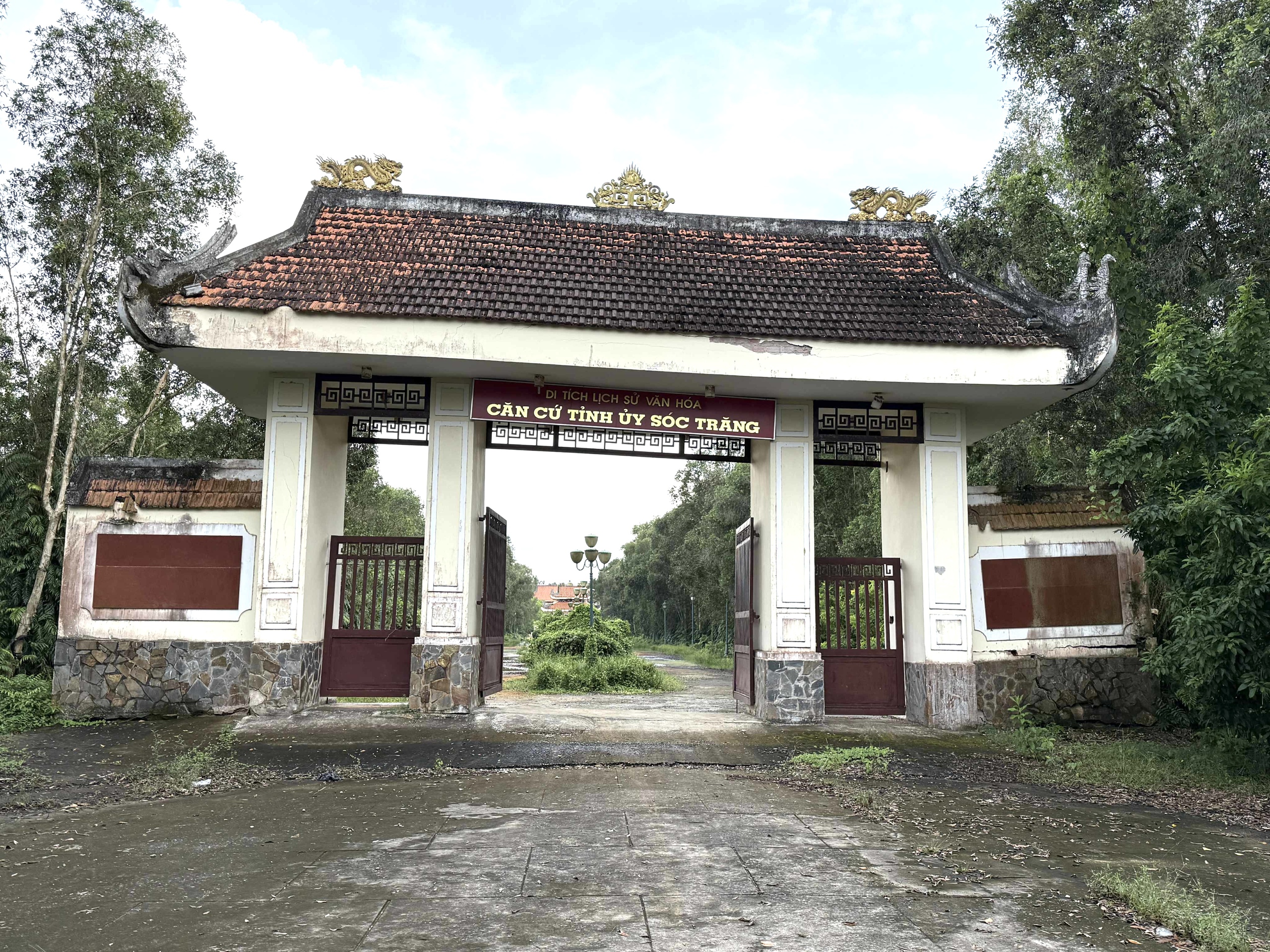 Theo ghi nhận của P.V, Khu di tích căn cứ Tỉnh ủy Sóc Trăng đang xuống cấp nghiêm trọng. Từ ngoài nhìn vào, cổng tam quan ghi dòng chữ "Di tích lịch sử văn hóa căn cứ Tỉnh ủy Sóc Trăng" bị nghiêng, hai bên móng sụp lún.