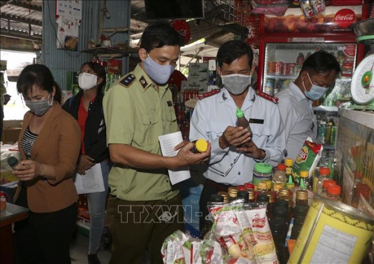 Kiểm tra các mặt hàng thực phẩm chay bày bán tại chợ Vị Thanh, thành phố Vị Thanh. Ảnh: Duy Khương/TTXVN
