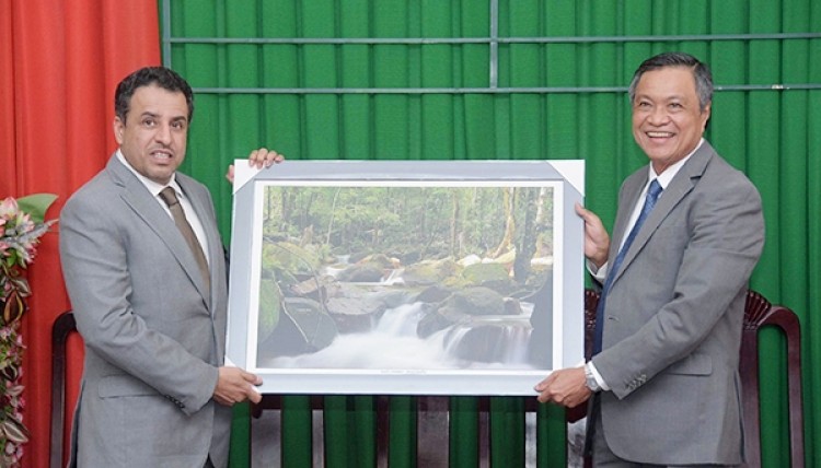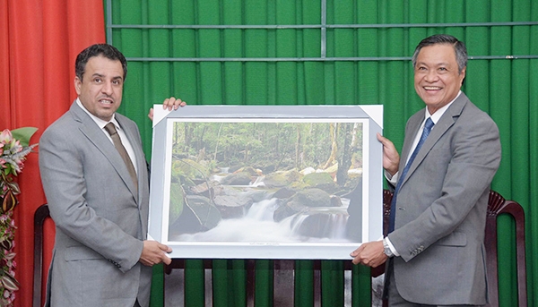 Chủ tịch UBND tỉnh Phạm Vũ Hồng (bìa phải) trao bức tranh kỷ niệm cho Ngài Obaid Saeed Bintaresh Al Dhaheri (bìa trái) Đại sứ đặc mệnh toàn quyền Các tiểu vương quốc Arab thống nhất tại Việt Nam. Ảnh: Quốc Tuấn