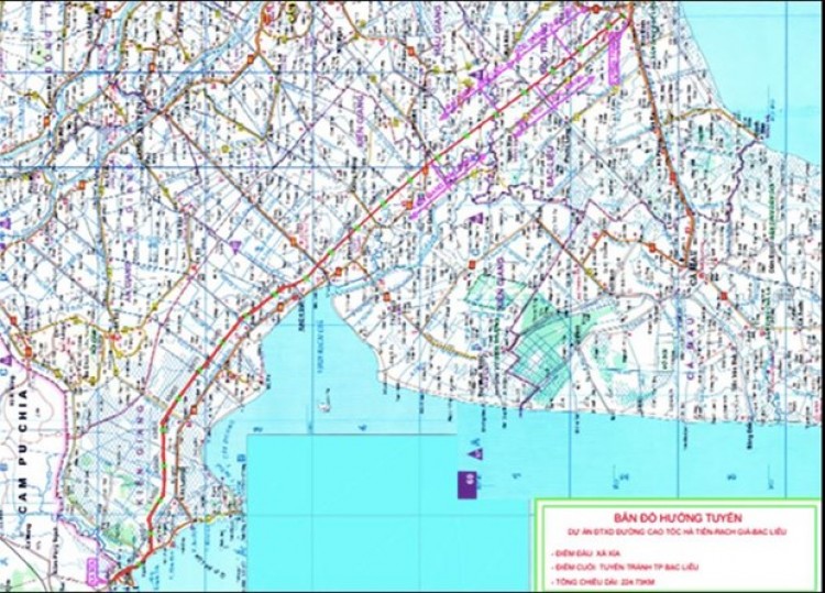 Bản đồ hướng tuyến cao tốc Hà Tiên-Rạch Giá-Bạc Liêu (đường màu đỏ). (Nguồn: Tổng công ty đầu tư phát triển và quản lý dự án hạ tầng giao thông Cửu Long)