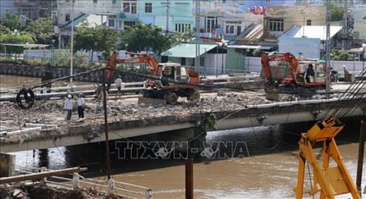 Thi công công trình thủy lợi cống Kinh Nhánh. Ảnh: Lê Huy Hải/TTXVN