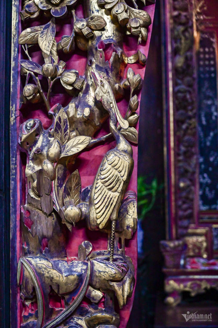 Nhà có 48 cây cột tròn, lớn, hoàn toàn bằng gỗ lim và căm xe. Du khách tham quan sẽ bị choáng ngợp bởi hình ảnh những bức chạm khắc vô cùng tinh tế và công phu. Nhiều hình thù rất thân thuộc trong đời sống hàng ngày như cua, cá, tôm, kì lân, phụng được thể hiện tỉ mỉ.