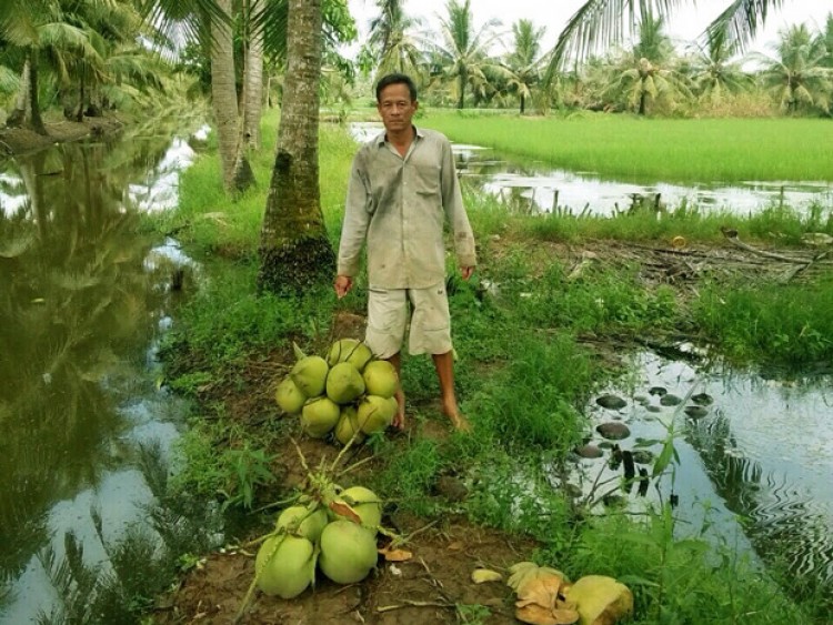 Ngoài ra, anh Khởi còn tận dụng bờ bao và khoảng 5 công đất vườn để trồng dừa, nuôi cá, nuôi heo…Vườn dừa của anh Khởi hiện có gần 300 gốc và đang trong giai đoạn thu hoạch rộ. Bình quân mỗi ngày anh bán cho thương lái khoảng 200 trái. Với giá bán khoảng 75 ngàn đồng/12 trái, anh Khởi thu về trên 800.000 đồng/ngày.