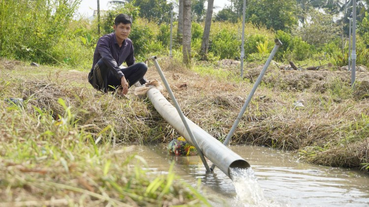 Nhiều người dân tranh thủ bơm nước vào ruộng dự trữ cho mùa hạn mặn dự báo sẽ kéo dài đến tháng 6 năm sau