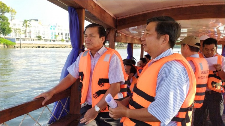 Phó Chủ tịch Thường trực UBND TP Cần Thơ Đào Anh Dũng đi thuyền kiểm tra thực tế tình hình thực hiện Kè Sông Cần Thơ (phía bờ quận Ninh Kiều). Ảnh: KHÁNH TRUNG