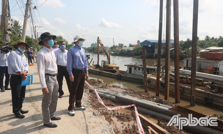 Đồng chí Lê Văn Hưởng khảo sát công đoạn đóng cọc tại công trình xử lý sạt lở ở kinh 28.