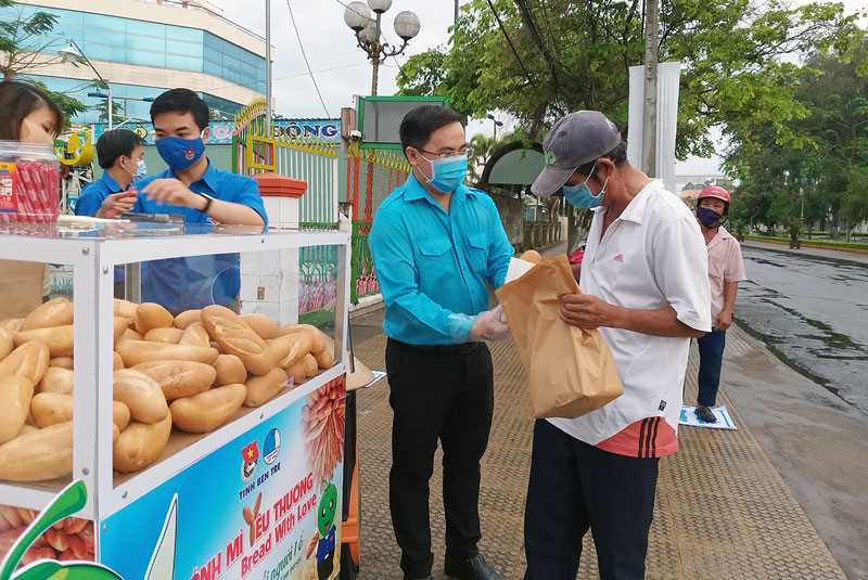 Anh Phan Thanh Trẻ cùng cán bộ đoàn tặng bánh mì và nhu yếu phẩm cho người dân tại hoạt động Tủ bánh mì yêu thương. Ảnh: Thanh Đồng