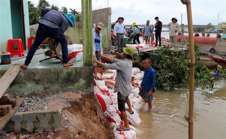 Người dân xã Xuân Hòa (Kế Sách, Sóc Trăng) đắp bao cát tại những chỗ bị sạt lở. (Ảnh: Trung Hiếu-TTXVN)