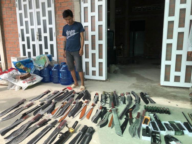Công an TP.Tân An phối hợp Công an xã Phú Ngãi Trị, huyện Châu Thành kiểm tra hành chính nhà đối tượng Hoàng tại địa chỉ trên còn phát hiện các công cụ gồm 7 cây gậy 3 khúc, 9 bình xịt hơi cay, 7 roi điện, 3 đèn pin roi điện; 46 con dao, đao, kiếm các loại.