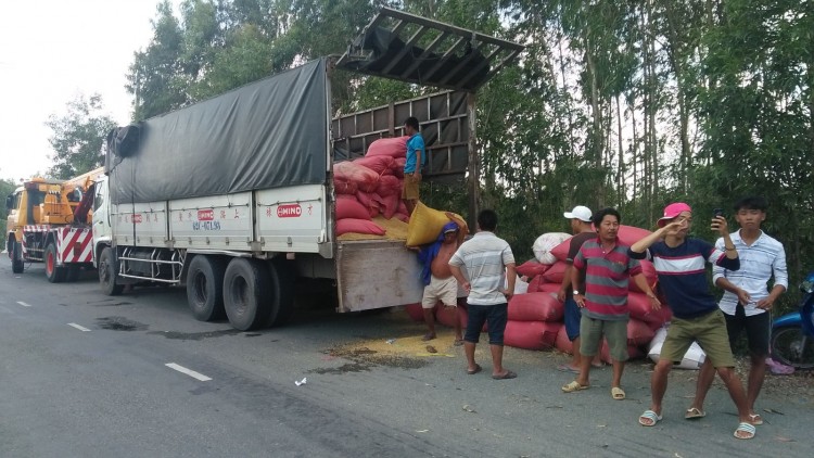 Nhóm người ra cản trở lực lượng chức năng còn tiến hành bốc dỡ nhiều bao lúa trên thùng xe bỏ lại bên lề đường