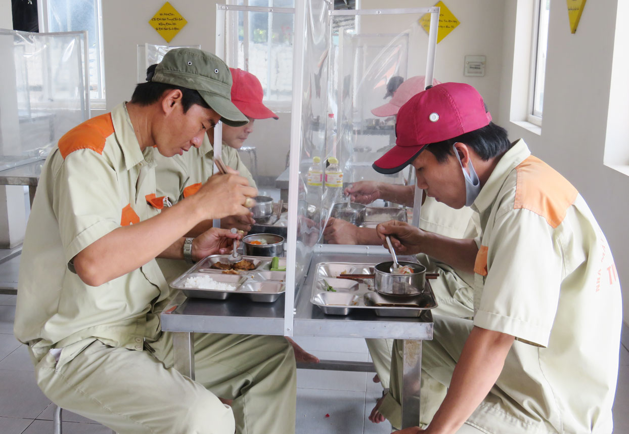 Công nhân tại nhà máy Tú Phương vẫn được hưởng các chế độ phúc lợi, cơm trưa đầy đủ, bàn ăn có vách ngăn