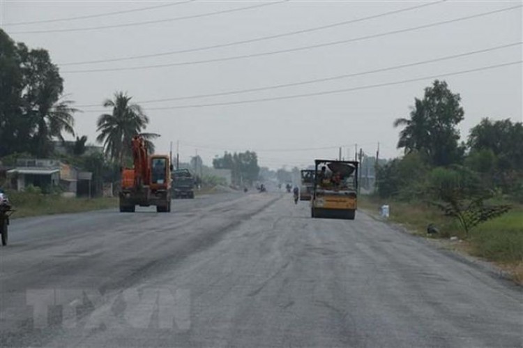 Thi công đường DT830 đoạn quan địa phận huyện Cần Đước, Cần Giuộc. (Ảnh: Bùi Giang/TTXVN)