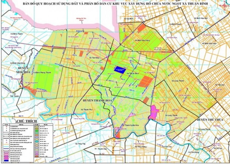 Quy hoạch dự án hồ chứa nước diện tích 140ha ở điểm màu xanh chính giữa bản đồ. (Nguồn: baolongan)