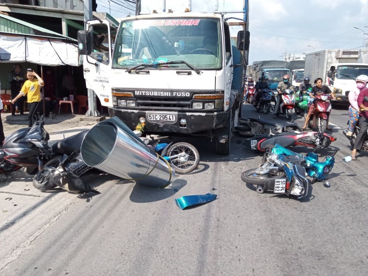 Lúc này, phía trước có hơn 10 mô tô đang dừng chờ tín hiệu đèn, tuy nhiên tài xế không thắng xe lại được. Lo sợ tai nạn xảy ra, phụ xế xe đập cửa, vừa truy hô cho những người phía trước chạy đi. Tuy nhiên, do khoảng cách quá gần, ô tô tải tông 7 mô tô.