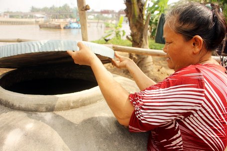 Bà Nguyễn Thị Thu Cúc (xã Trung Thành Đông- Vũng Liêm) sử dụng nước mưa dự trữ thay cho nước máy vì ảnh hưởng xâm nhập mặn.