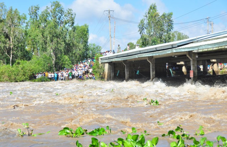 Nước lũ năm 2019 ở miền Tây được dự báo là về muộn và nhỏ hơn năm 2018 (Trong ảnh, người dân chứng kiến cảnh xả lũ ở tỉnh An Giang trong năm 2018)