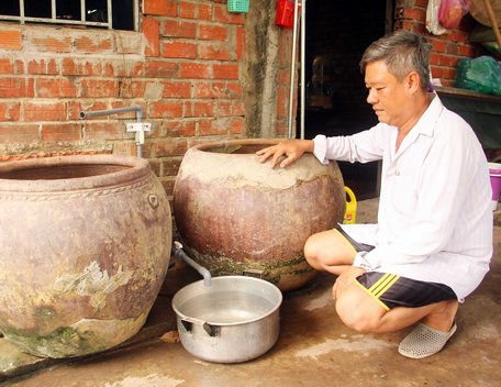 Thời gian qua, mặn xâm nhập luôn duy trì ở mức gây hại cây trồng, nên công chôm chôm của ông Quách Văn Mười (ấp Bình Hòa 2, xã Bình Hòa Phước- Long Hồ) còi cọc lá, mương thì khô cạn nước tưới. Gia đình ông Mười càng thêm lo lắng vì nước sinh hoạt cũng chỉ nhỏ giọt, canh hứng nước cả tuần mà không đầy một lu nên ông Mười mua nước thùng để dùng vào việc nấu nướng, còn tắm giặt thì múc nước sông.