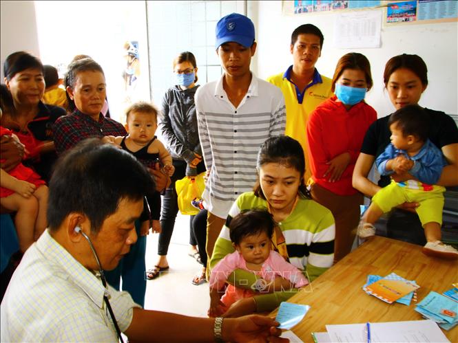 Phụ huynh đưa trẻ đến Trạm y tế xã Lý Văn Lâm, thành phố Cà Mau, để thăm khám, tiêm chủng phòng bệnh sởi -rubella. (Ảnh tư liệu)
