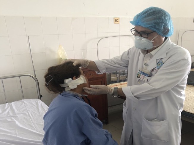 Bác sĩ thăm khám vết thương sau phẫu thuật tái tạo vành tai.Ảnh: HẢI DƯƠNG