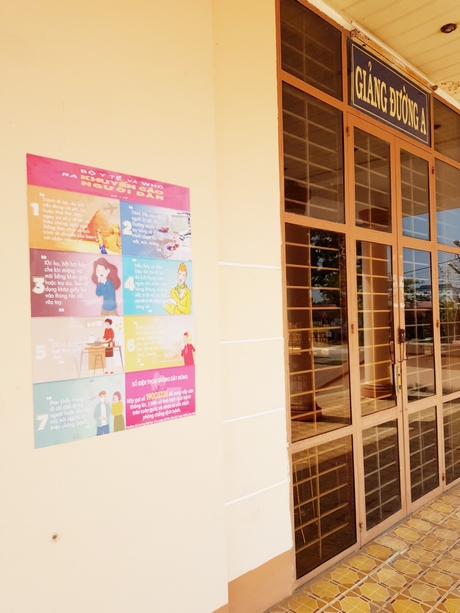 Giảng đường ở ĐH Cửu Long dán áp phích tuyên truyền, phổ biến thông tin về corona.