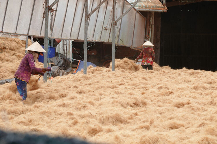 Trong sân phơi bên cạnh xưởng, bà Đoàn Thị Hồng (44 tuổi), người có hơn 10 năm làm nghề, thoăn thoắt đảo từng đống xơ dừa. Bà cho biết: "Nếu nắng tốt, phơi một ngày là khô, còn trời râm hay mưa thì lâu khô lắm. Công việc không nặng nhọc nhưng phải đứng ngoài nắng suốt ngày. Tiền công tính theo sản lượng, trung bình mỗi ngày tôi kiếm được 200.000 - 250.000 đồng".