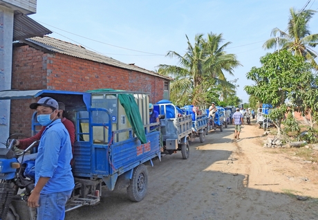 Biết tin tàu của Hải đoàn 129 chở nước ngọt về cấp miễn phí, ngay từ sáng sớm tại bến Vàm Mơn có rất đông người dân mang theo can, thùng nhựa, xe chở bồn nước và dùng cả ghe đến chờ tàu 937 cập bến để nhận nước ngọt về phục vụ sinh hoạt cho gia đình.