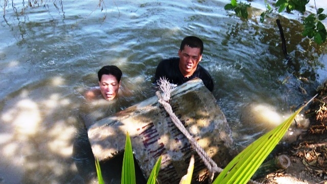 Cán bộ và người dân đưa thùng chứa rác lên bờ.
