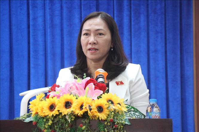 Phó Trưởng đoàn chuyên trách Đoàn đại biểu Quốc hội tỉnh Bến Tre Nguyễn Thị Yến Nhi phát biểu tại hội nghị.